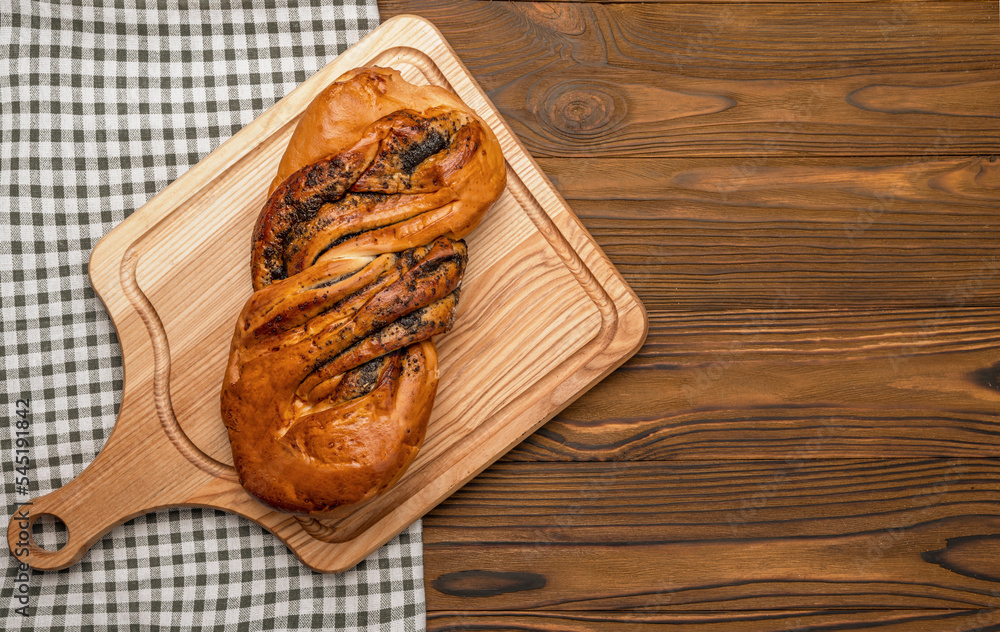 Homemade freshly baked poppy seed roll. Wood rustic table, board. Rural food cooking. Top view