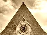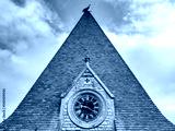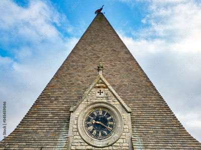 High level view of a large clock seen in a English clock tower with the church spire and metal weathercock atop.