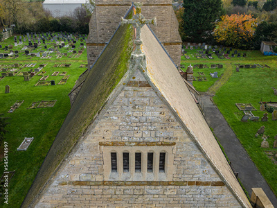 Drone view of the top of an apex roof of a typical English church. Showing the stone crucifix at the roof apex.