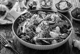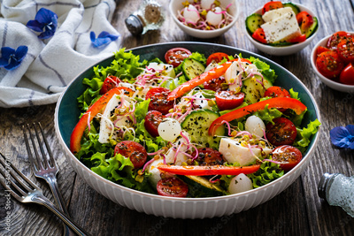 Tasty salad - manouri cheese and fresh vegetables on wooden table