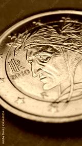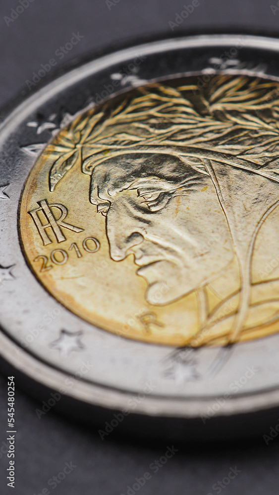 Euro coins closeup. 2 euro coin lies on dark gray surface. Coin issued in Italy. Obverse depicting Dante Alighieri. Vertical stories about European Union currency or ECB. EU economy news. Macro
