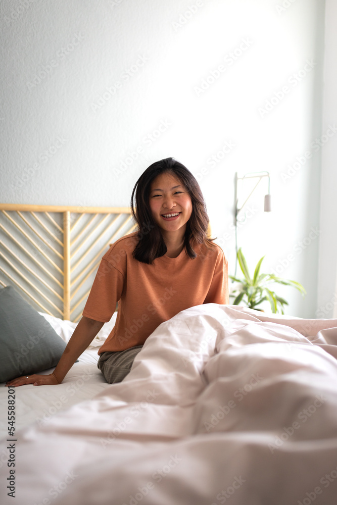 Smiling asian girl sitting on bed after waking up in the morning at home looking at camera. Vertical. Copy space.