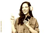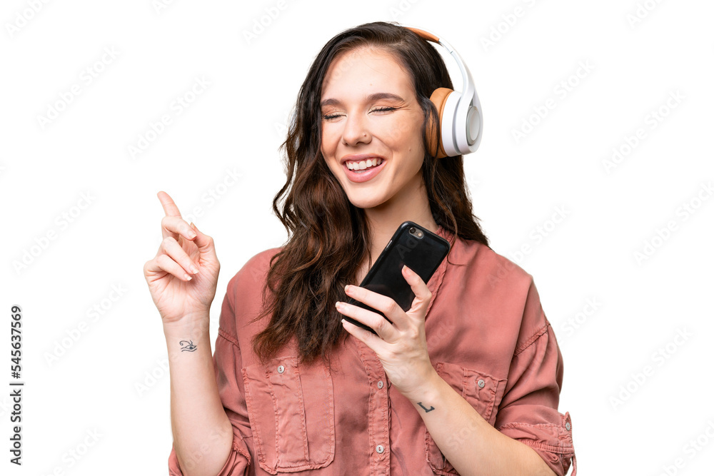 Young caucasian woman over isolated background listening music with a mobile and singing
