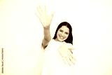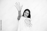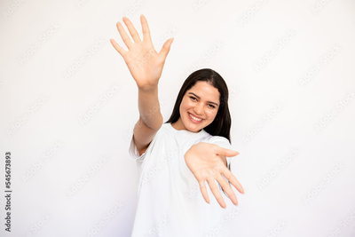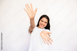 Portrait of happy young woman stretching arms for embrace over white background. Caucasian lady wearing white T-shirt showing palmes and smiling. Happiness concept