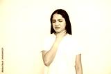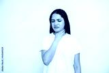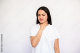 Portrait of displeased young woman touching her throat over white background. Caucasian lady wearing white T-shirt suffering from tonsillitis. Pulmonary diseases concept