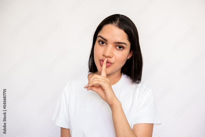 Portrait of confident young woman standing with finger on lips over white background. Caucasian lady wearing white T-shirt making silence gesture. Secret and silence concept