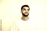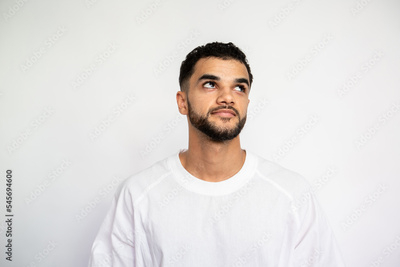 Portrait of confident young man looking away on white background. Bearded man wearing white T-shirt posing with thoughtful expression. Uncertainty and doubt concept