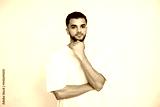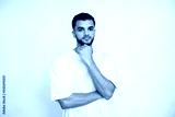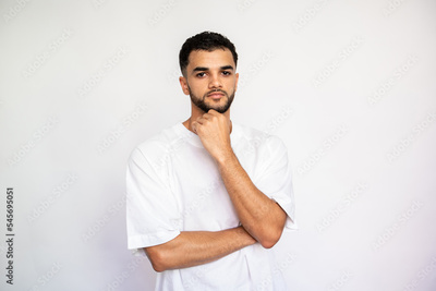 Portrait of attentive young man leaning on hand. Focused Caucasian male model with dark hair and beard in white T-shirt looking at camera, thinking while touching chin. Focus, contemplation concept