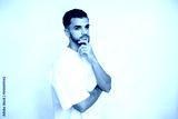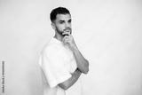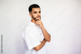 Portrait of focused young man thinking. Pensive Caucasian male model with dark hair and beard in white T-shirt looking away with hand on chin. Focus, contemplation concept