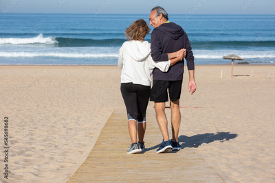 Back view of happy elderly couple resting on sea beach. Grey-haired man and woman walking together after jogging and admiring endless blue sea. Health and active lifestyle of aged people concept