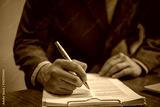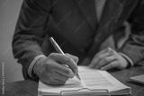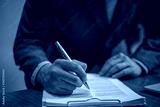 businessman signs documents with a pen making the signature on desk.