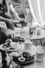 Vertical shot of a gourmet fast food restaurant table with burgers, fries, and drinks