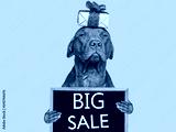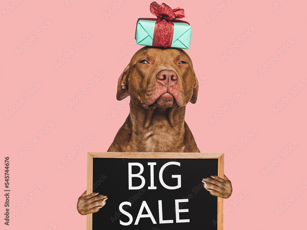 Cute puppy and sign with inscription about sale. Closeup, indoors. Day light, studio shot. isolated background. Preparing for sales
