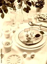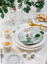 Christmas table setting with eucalyptus, cutlery and candles in white and green tone