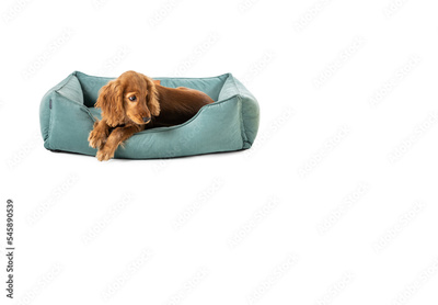 Cute puppy dog resting on dog bed isolated