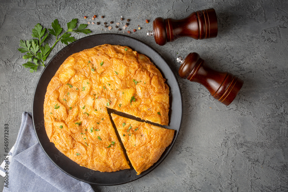 Spanish omelette with potatoes, typical spanish cuisine on gray concrete floor. Tortilla Espanola. Turkish name; Yumurtali patates