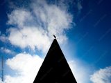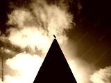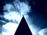 Deep silhouette of a weathercock atop of spire of an old church. Showing the west and east compass points.