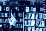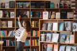 Teen girl among a pile of books. A young girl holding books with shelves in the background. She is surrounded by stacks of books. Book day.