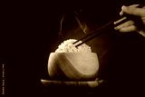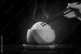 Cooked organic basmati brown rice with steam and chopsticks