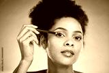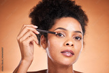 Eye pencil, black woman and makeup for eyeliner, confidence or natural beauty against brown studio background. African American female, girl or cosmetics for wellness, creative and eyelash for beauty