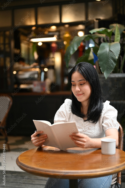 Attractive young Asian female reading a book while relaxing in the beautiful coffee shop.