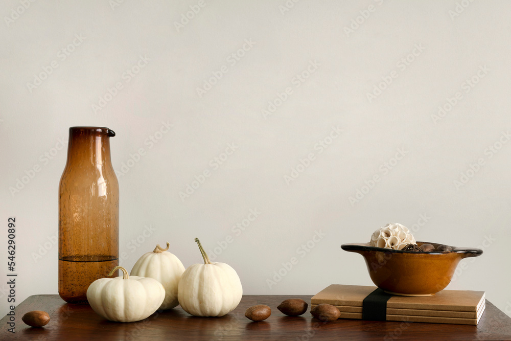 Minimalist composition of living room interior with wooden commode, pumpkins, brown glass carafe, bowl with nuts, books, beige wall and personal accessories. Home decor. Template.