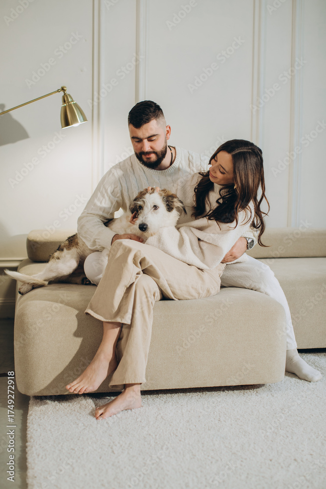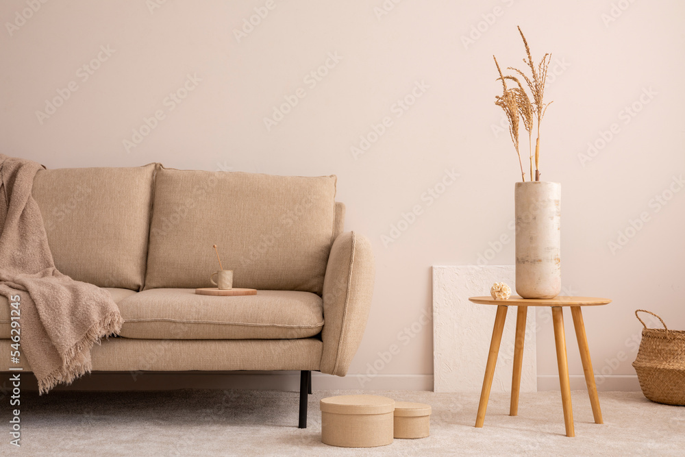 Interior design of cozy living room with elegant beige sofa, round wooden coffee table, bright vase with dried flowers, round box, bright rug and stylish personal accessories. Home decor. Template.