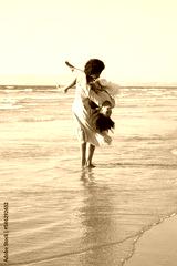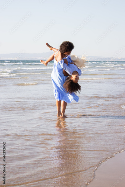 Jolly mother and daughter playing on beach. African American family making faces, hugging, laughing, fooling around. Leisure, family time, bonding concept