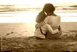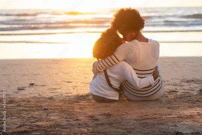 Back view of loving mother and daughter looking at sunset. Mother and daughter sitting on sand, hugging, looking at each other. Family, love, bonding, nature concept