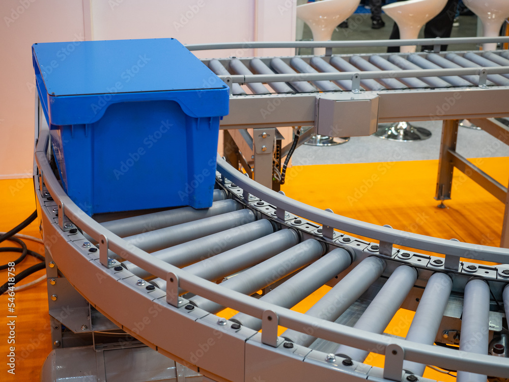 Blue box on production line. Conveyor close-up. Storage equipment