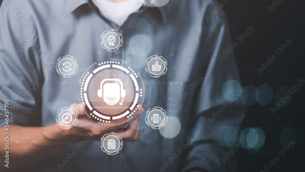 man holding smartphone showing a concept Customer Support Hotline Contact Us Connectivity ,Cyberspace through the online system in everyday life. that plays a role in finance, shopping and marketing