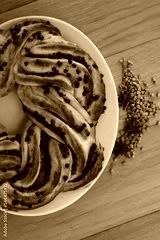 Chocolate and orange jam braided Brioche bread on a plate on wooden table
