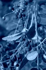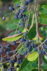 Close-up of blue berries on branch of common privet hedge. Ligustrum vulgare tree in the garden