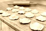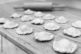 Raw dumplings polish traditional perogies lying on wooden board in kitchen