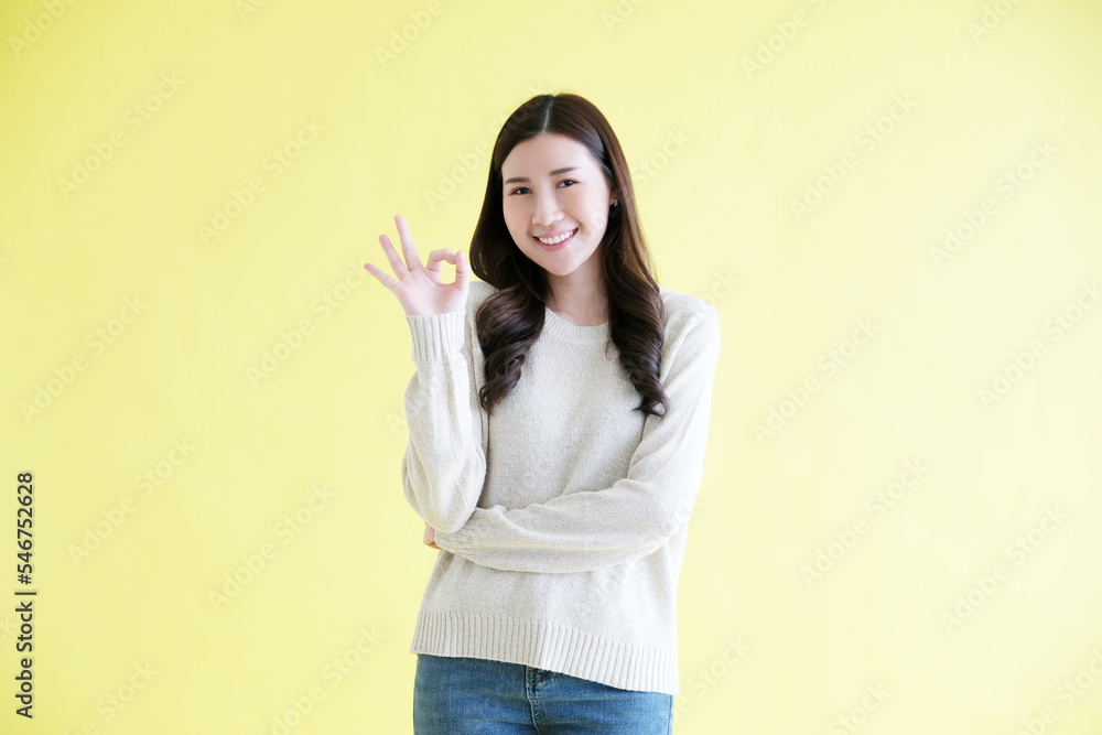 Young asian woman showing ok hand sign and smiling while standing over isolated yellow background, Happy asia female showing ok hand, Positive people gesture