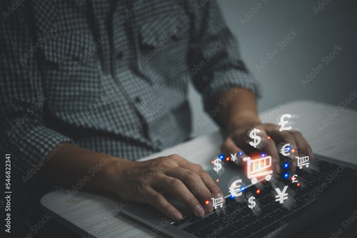 Virtual trolley shopping cart icon and currency money sign, buy on internet, e-commerce, Businessman hand typing on keyboard with online shopping concept.