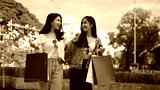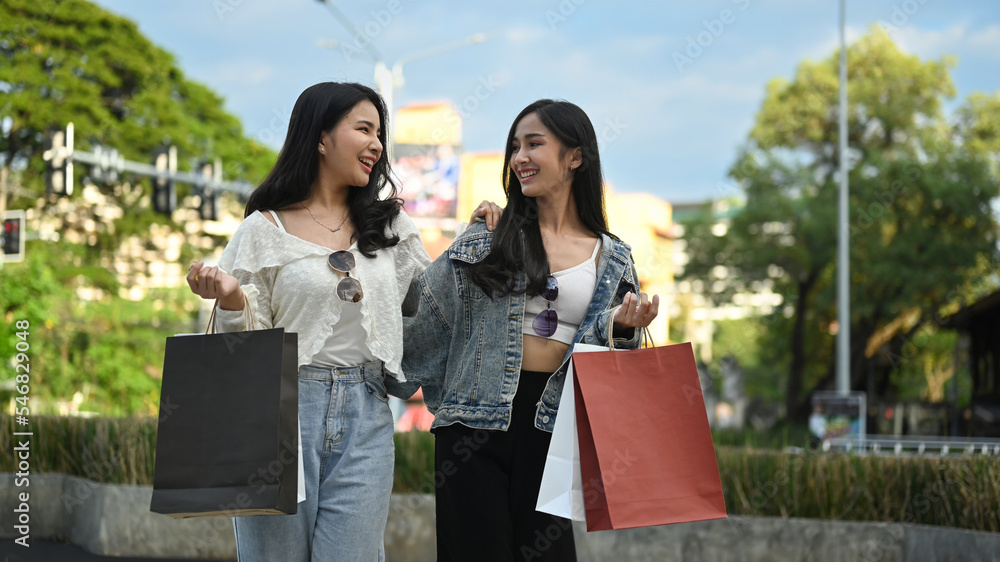 Two happy women friends enjoy doing shopping together along the city streets. Friendship, shopping and city lifestyle concept