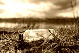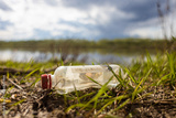 Abandoned garbage waste on nature. Environmental damage caused by human garbage pollution. Left plastic bottle among the grass on the river bank