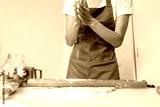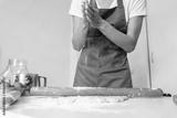 A woman in a special apron cooks at home. Rolling out and preparing dough for baking.