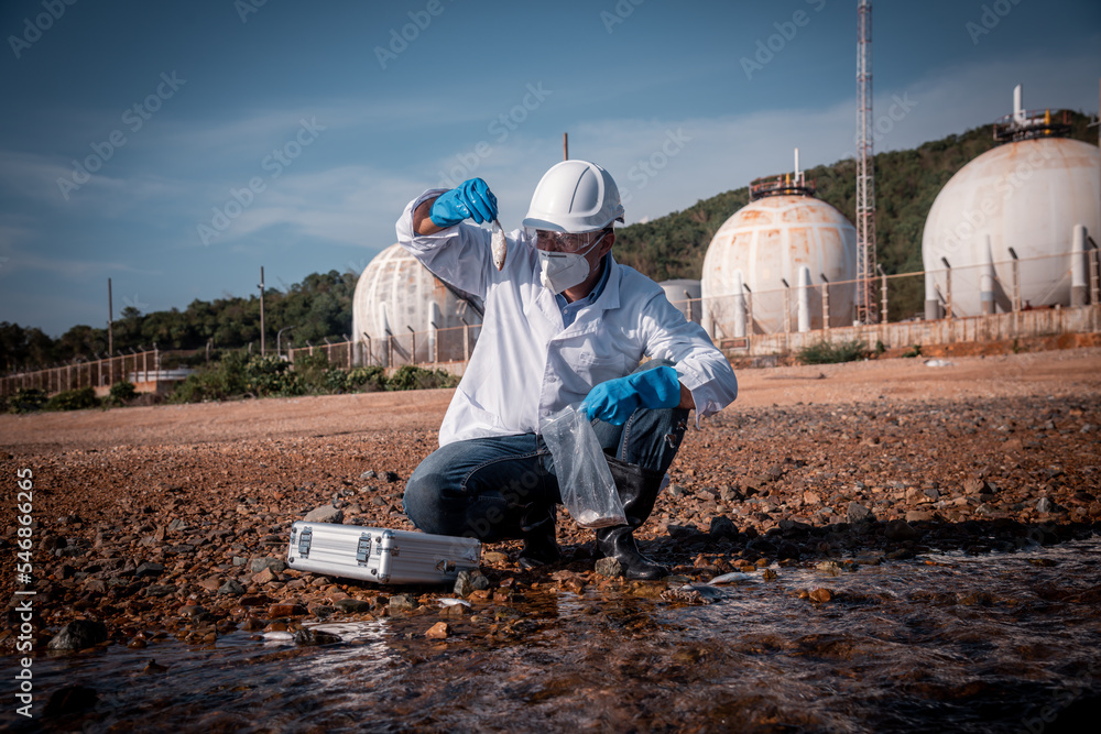 Worker under checking the waste water treatment pond industry large to control water support industry