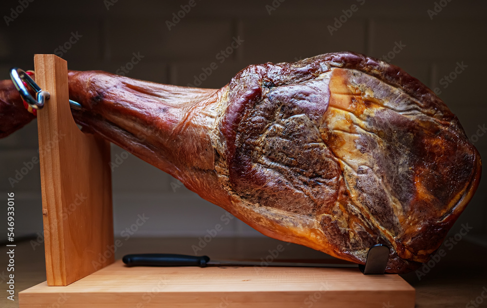 Dry-cured spanish ham. Jamon on a wooden stand.