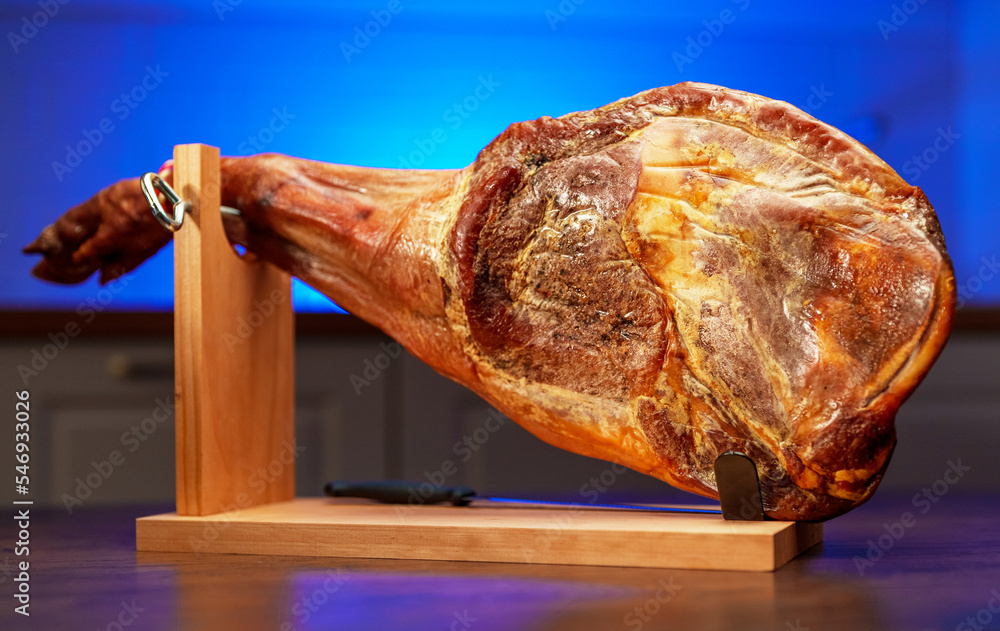 Dry-cured spanish ham. Jamon on a wooden stand.