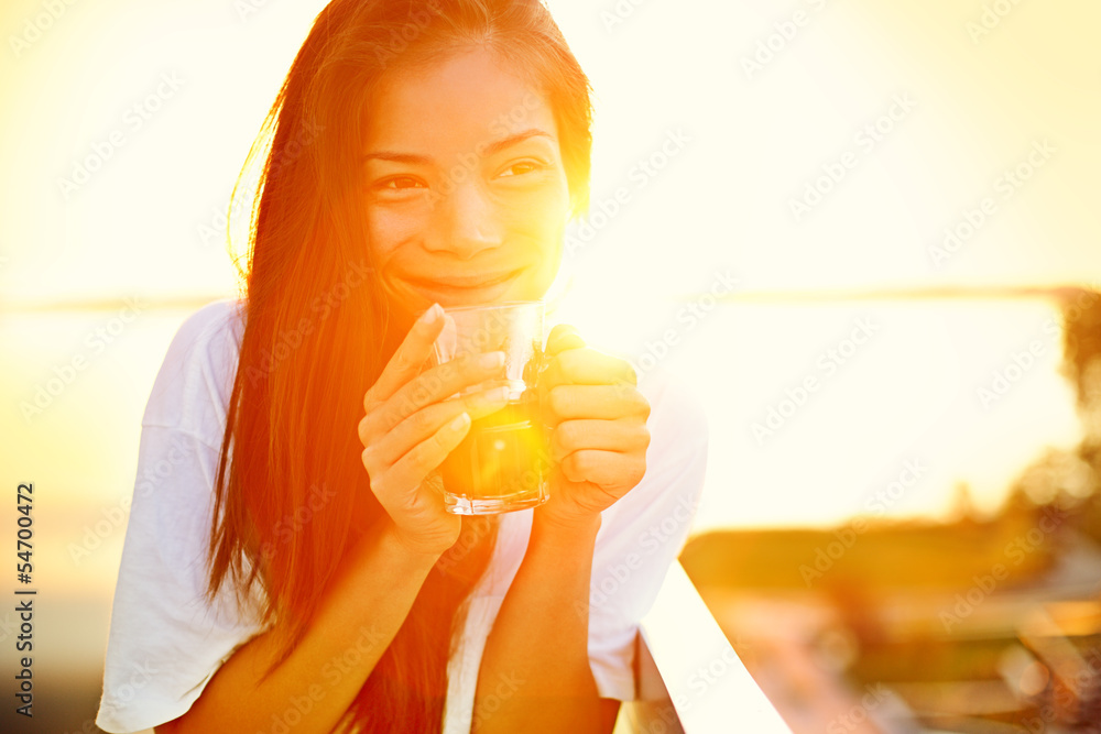 Asian woman drinking coffee in sun