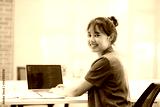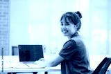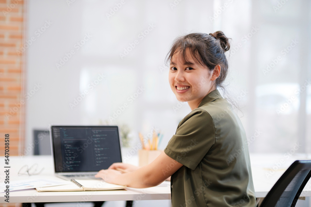 Close up of Businesswoman working at office using laptop Businesswoman smiling at camera.