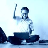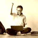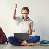 Education, woman student with laptop and celebrate university exam results, college scholarship news and learning success. Smart girl, study on floor and fist pump school test report with happy smile