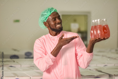 American worker inspecting beverage in factory, American worker employee food factory industry