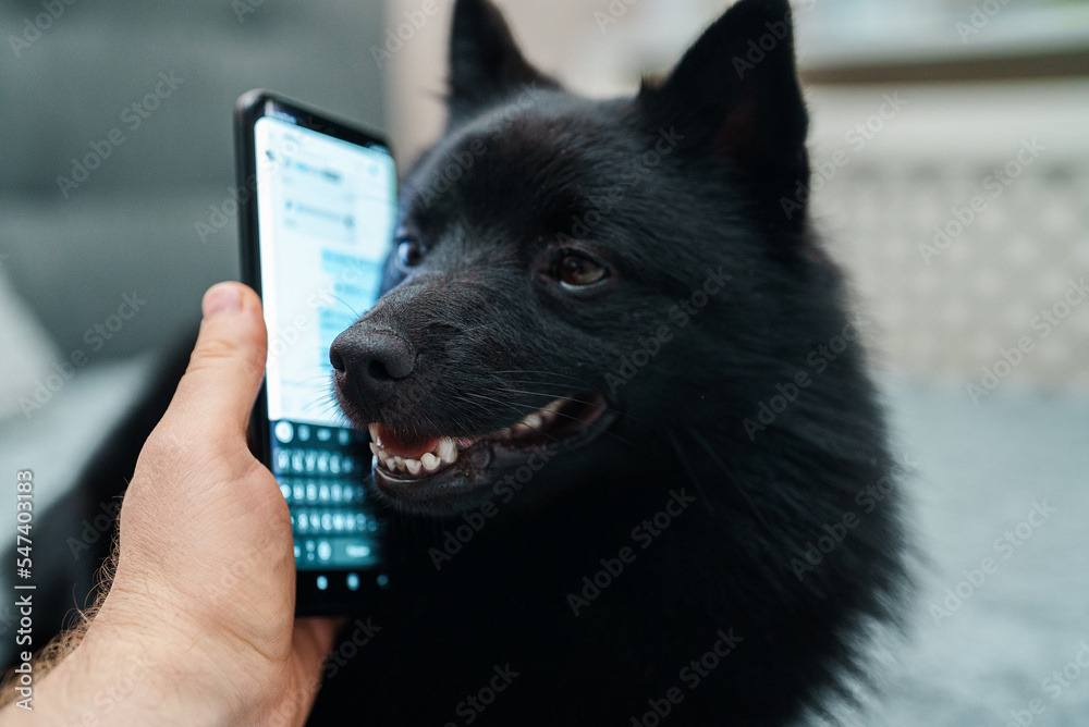 Portrait of Schipperke dog talking by phone.
