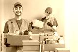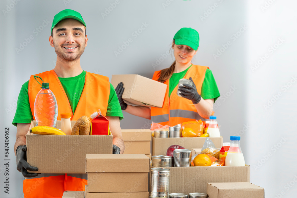 Food Distribution. Volunteer carrying food donation box. A young smiling man wearing green uniform cap and t-shirt, orange vest holds out a set of free food for poor people