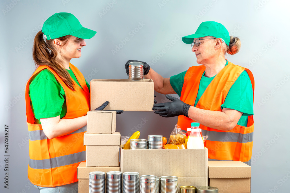 Help Collection Center, free food distribution. Volunteers wearing uniform green caps, t-shirts, orange vests prepare a food package grocery set for in-need people, sort, collect food donation boxes