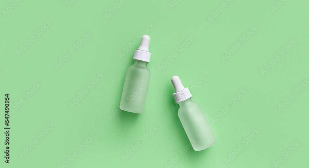 Two white matte bottles on pastel green background. SPA natural organic cosmetics. Glass cosmetic bottles with pipette, anti aging serum, collagen, peptides, cosmetics mockup, skincare concept. Flat